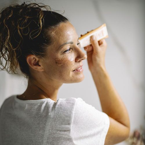 Zum Peelen sanfte kreisende Bewegungen ausführen, um Unreinheiten und abgestorbene Hautzellen zu entfernen. Mit einem weichen Schwamm mit warmem Wasser oder mit den Fingern unter fließendem Wasser entfernen.