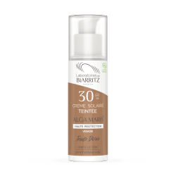 Give your face the benefits of the latest scientific innovations from Laboratoires de Biarritz. The organic tinted sunscreen SPF30 ensures a high natural sun protection for everyday use. It is perfect to use for outside activities as well as downtown, it protects and unifies the skin. The SPF30 tinted sunscreen provides your skin with effective broad spectrum protection against UVB and UVA thanks to its mineral screens. It also defends against the dangers of free radicals on skin cells like the appearance of early signs of aging, thanks to its unique patented extract of a red seaweed that has strong antioxidant properties. Above all it is a shiled against the sun that also moisturizes.
